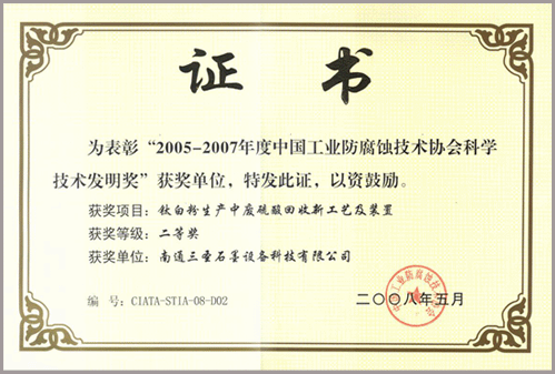 該技術(shù)通過了江蘇省科技廳科技成果鑒定,先后獲得:南通市人民政府科學(xué)技術(shù)進(jìn)步二等獎(jiǎng)、武漢市人民政府科學(xué)技術(shù)進(jìn)步二等獎(jiǎng)、中國工業(yè)防腐蝕技術(shù)協(xié)會科學(xué)技術(shù)發(fā)明二等獎(jiǎng)并在多家鈦白企業(yè)中得到了應(yīng)用。