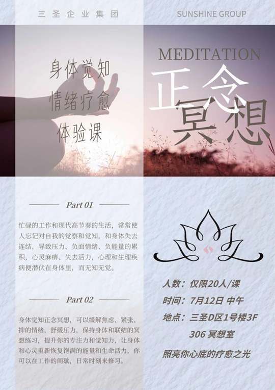 三圣集團(tuán)最新開設(shè)的冥想課程,旨在幫助職工通過冥想達(dá)到內(nèi)心的寧靜與平和,提升個人的情緒管理、專注力和生活質(zhì)量。隨著今天第一堂體驗課的啟動,之后每周都有免費的公益課程可報名參加。這一全新形式的開放課程,升華了三圣企業(yè)文化的精神內(nèi)涵。