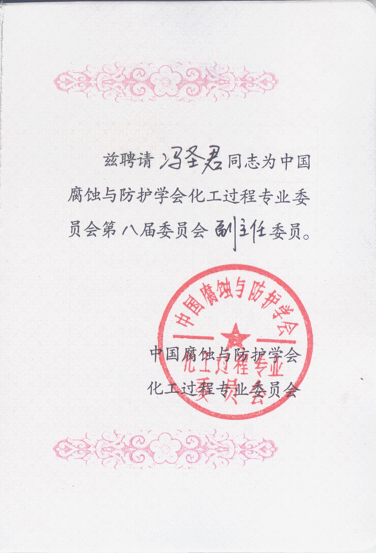 鑒于馮圣君在中國腐蝕與防護領(lǐng)域的杰出貢獻與不懈追求,中國腐蝕與防護學(xué)會經(jīng)過認真考察,決定聘任其擔任化工過程專業(yè)委員會副主任,代表企業(yè)界參與學(xué)會工作。