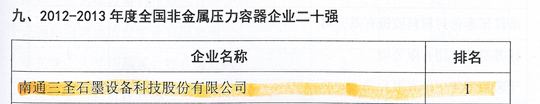 在剛剛閉幕的第五屆中國國際腐蝕控制大會(huì)上,南通三圣石墨設(shè)備科技股份有限公司憑借其優(yōu)異的業(yè)績(jī)榮登三大榜單,分別是:"2012-2013年度全國防腐蝕行業(yè)二十強(qiáng)企業(yè)"(排名第7位);"2012-2013年度全國非金屬壓力容器企業(yè)二十強(qiáng)"(排名第1位);"2012-2013年度全國防腐蝕行業(yè)外貿(mào)出口企業(yè)二十強(qiáng)"(排名第6位)。